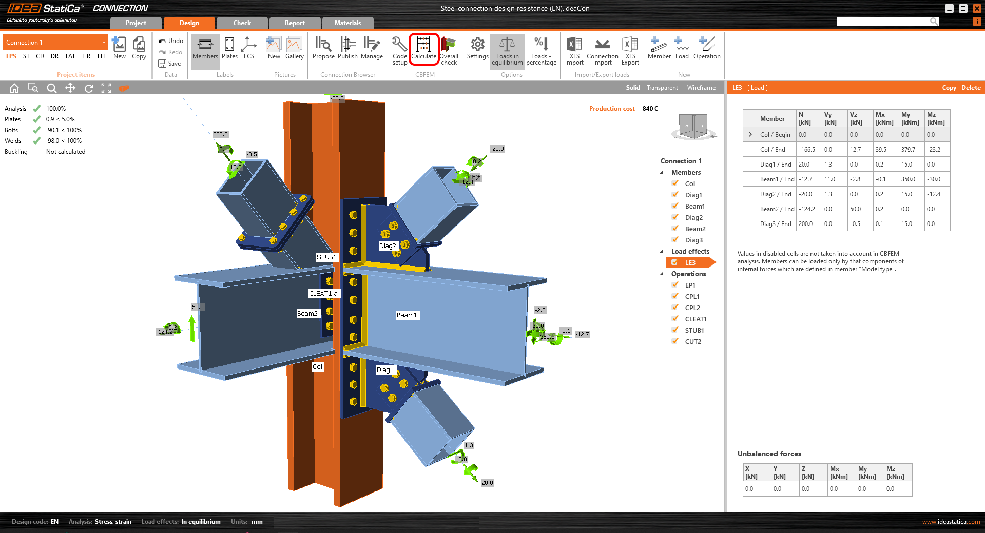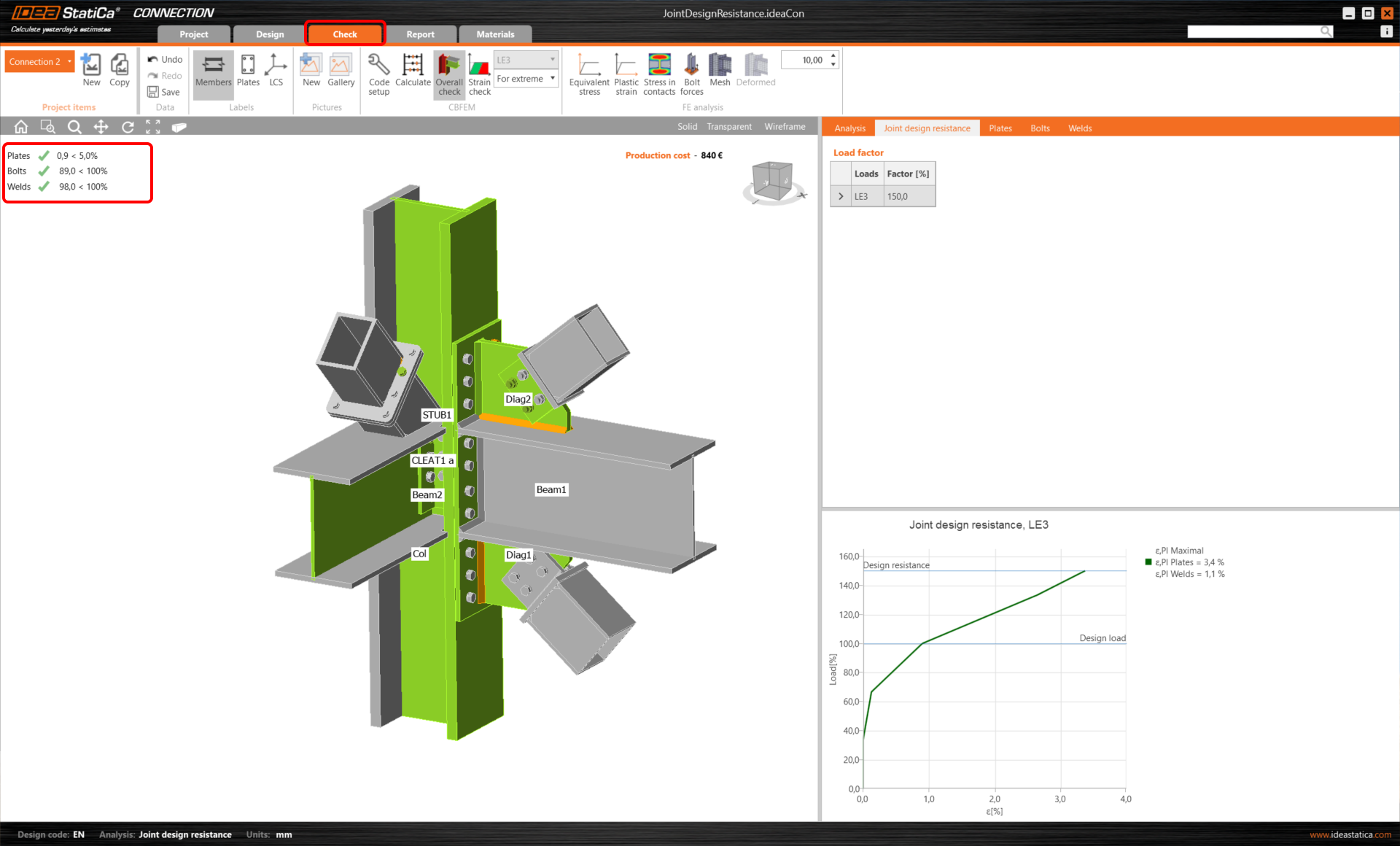 Proceed to the Check tab and Joint design resistance in the result tables. The application calculated the factor (percentage) of the applied load to reach the design resistance of the connection. Under the table, the load path is displayed.