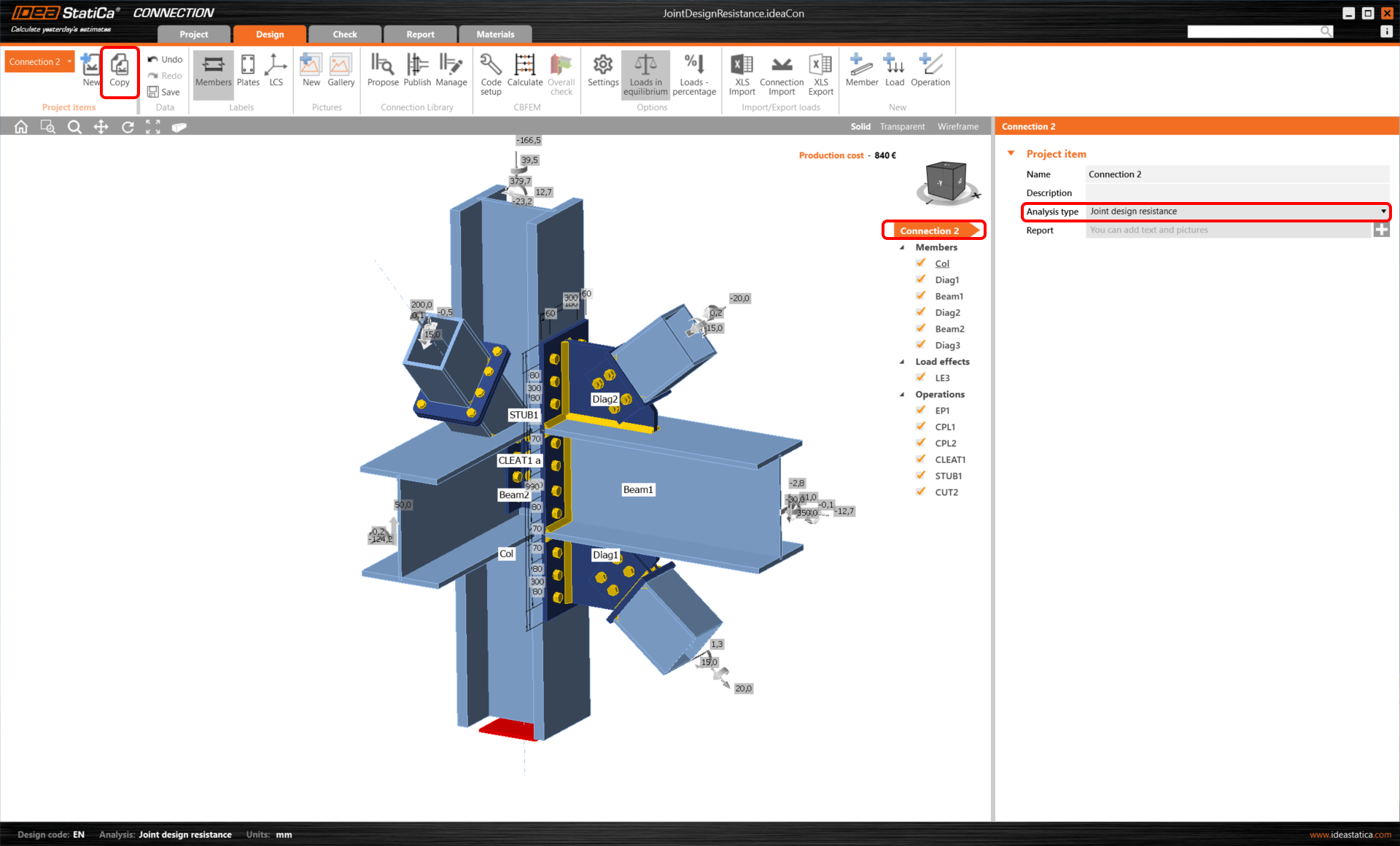 Copy the project item first to save the previous work and change the analysis type to DR (Joint design resistance) for the new project item (Connection 2).