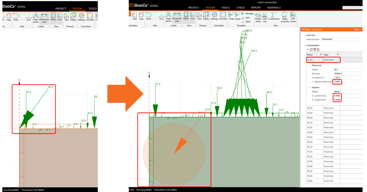 • If an edge point load creates tension on the edge (e.g., from lateral load), nonlinear analysis may fail.