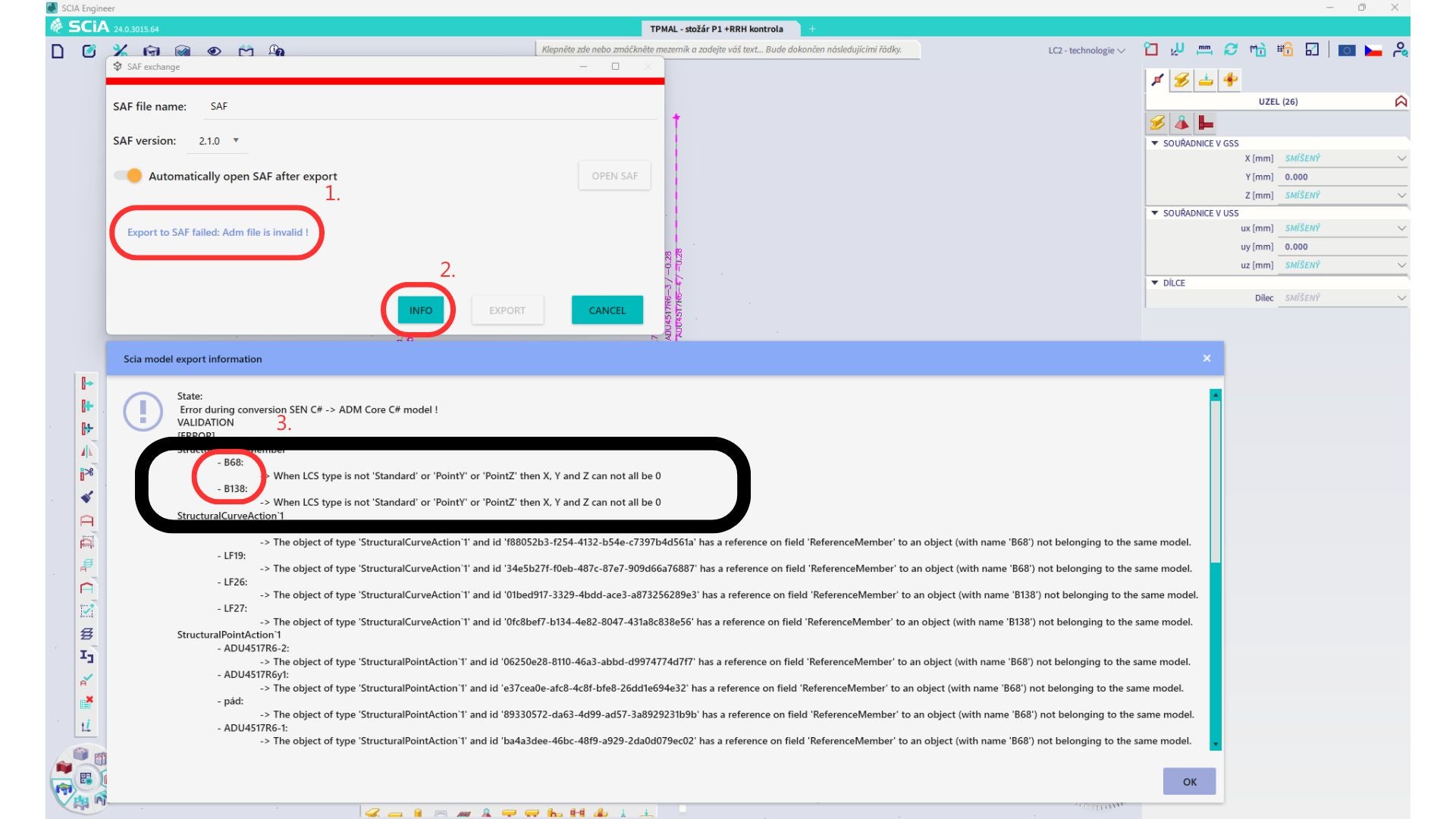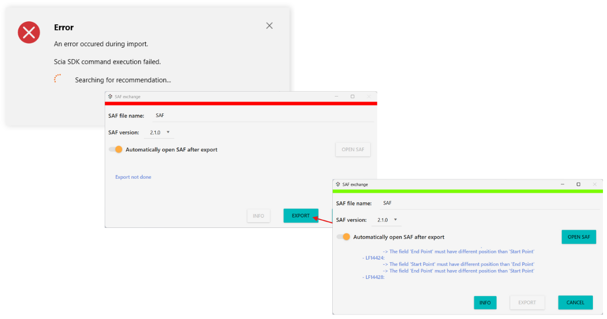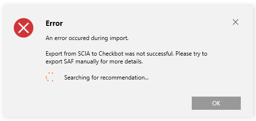 Limitation:  SCIA is unable to create a SAF file used for Bimlink communication. The issue represents itself with the following error in Checkbot and the following message when exporting the SAF model directly from SCIA.