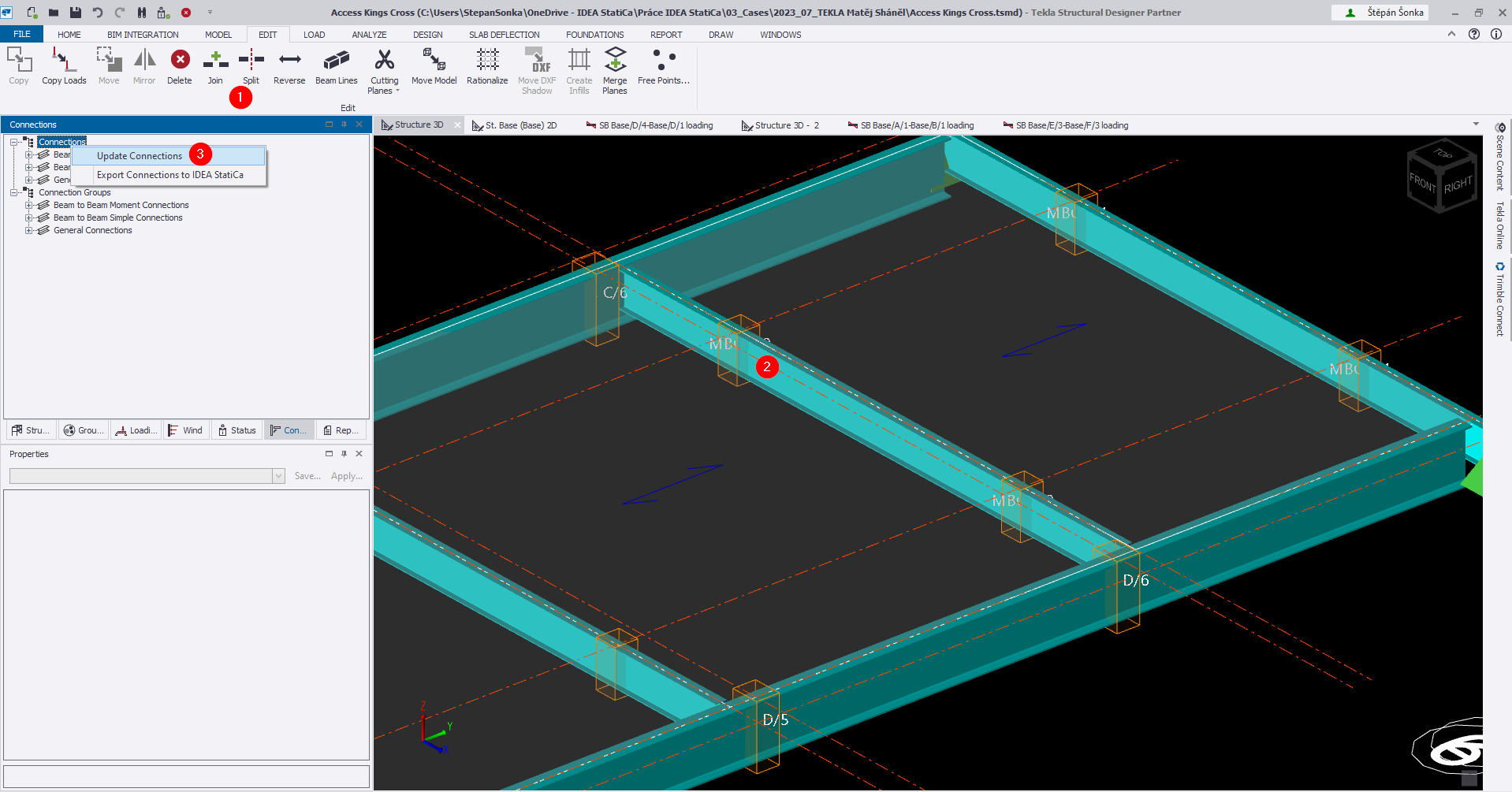 Workaround: In Tekla Structural Designer use the command "Split" (1) for dividing the selected member in spans (2). Once the member is divided, regenerate the Connection in Tekla Structural Designer (3), connections are then generated between two members and they will be correctly imported to IDEA StatiCa.