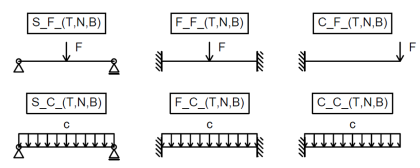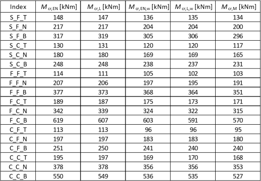 A total of 18 individual cases was analyzed to verify the LBA module. All of them share the same cross-section IPE 300 and the same steel grade S 355. Three different boundary conditions were investigated (S – simple, F – fixed, C – cantilever), each with two load cases (F – force; C – continuous). Three load positions in relation to the shear center are verified (T – top, N – neutral, B – bottom).