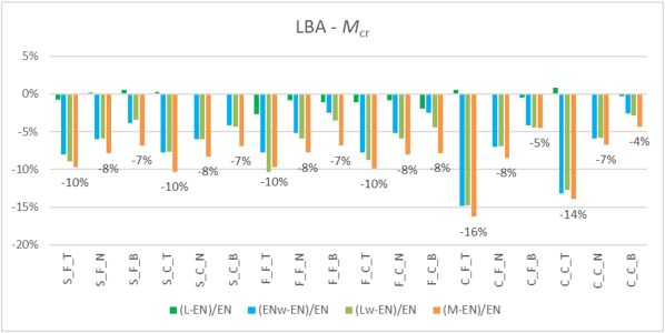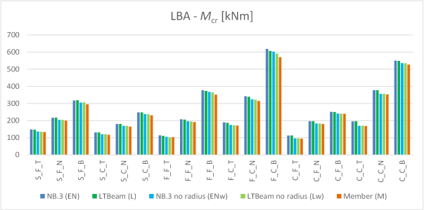 The elastic critical moment from IDEA Member (M) is compared to an analytical value for a rolled cross-section (EN) and for its representation without the web-flange radii (ENw). Furthermore, the same two sets of values are presented as an output from the LTBeam software (L, Lw).