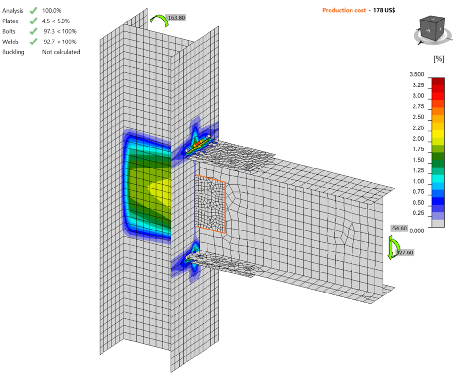 3. The connection in the provided IDEA StatiCa file has a modeling error. Run an analysis and view the results and identify the error. Visual results such as the deformed shape, plastic strains, or contact pressure are often the most helpful for identifying modeling errors.