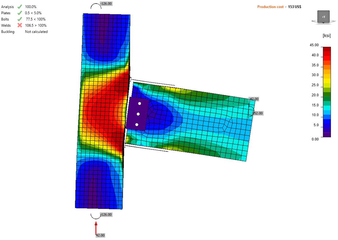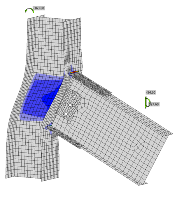 A result of these differences is that different skills and knowledge are necessary for traditional connection design and connection design by inelastic analysis. Selecting a load path, listing out potential limit states on the path, and executing calculations for each is not necessary for design by inelastic analysis. The software does those tasks. Yet, skill and knowledge remain necessary with design by inelastic analysis. For example, the designer must be able to lay out the connection and ensure that it can be fabricated. However, these skills are not unique to design by inelastic analysis. This exercise focuses on skills and knowledge that are more critical or unique to design by inelastic analysis. Chief among them is interpreting analysis outputs which is important for ensuring the model is defined correctly, understanding the behavior of the connection, and informing your judgment in design.