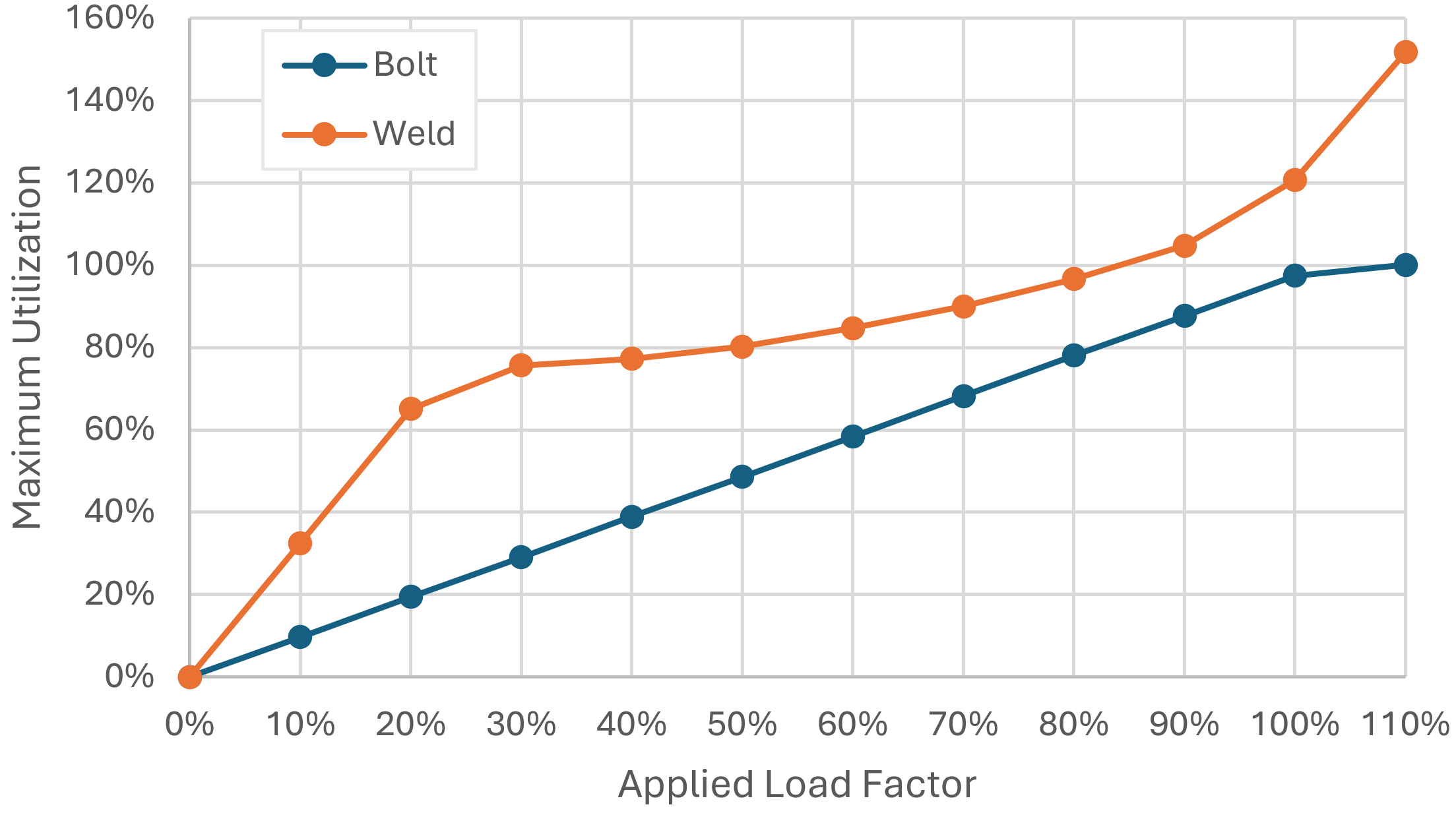 • Create plots of load vs plastic strain, load vs bolt utilization, and load vs weld utilization.