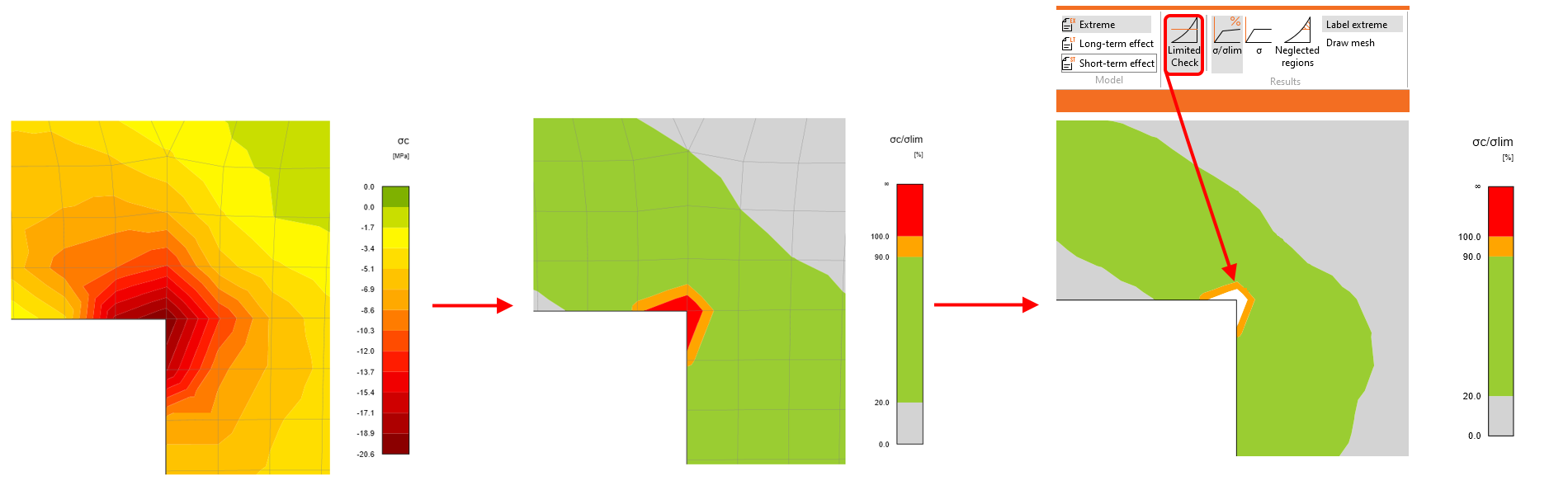 Stress peaks (singularities) can be neglected from the stress limitation check! Before we explain this option in detail, let's recall how the singularity, which can be neglected, and stress concentration, which cannot be neglected, differ. In the figure below, you can see a typical stress peak (singularity) in a sharp corner and a typical stress concentration around an opening.