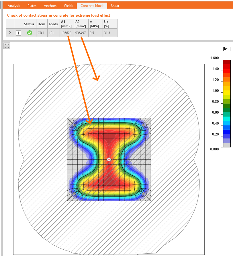 The resistance of concrete in compression may now be reduced by stress cut-off ratio in Code setup. The loaded area, A1, is determined as the area, where stress in concrete is higher than the peak stress multiplied by stress cut-off ratio. Loaded area A1 and Supporting area A2 are shown in 2D window. The stress cut-off ratio is set by default to 0.4.