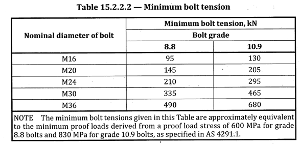 For bolts grade 8.8 (fuf = 830 MPa) and grade 10.9 (fuf = 1040 MPa), the minimum bolt tension is taken from AS 4100:2020, Table 15.2.2.2: