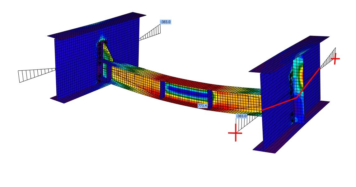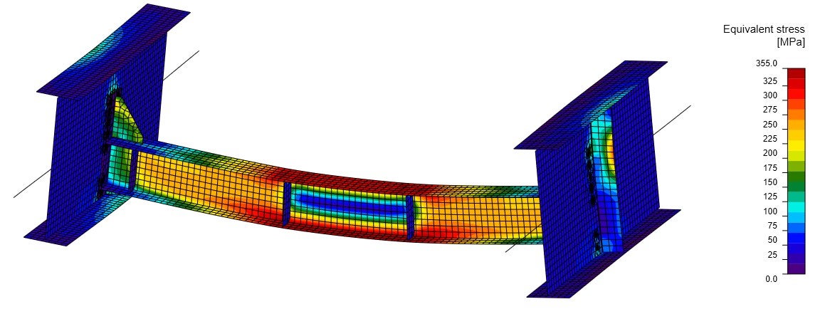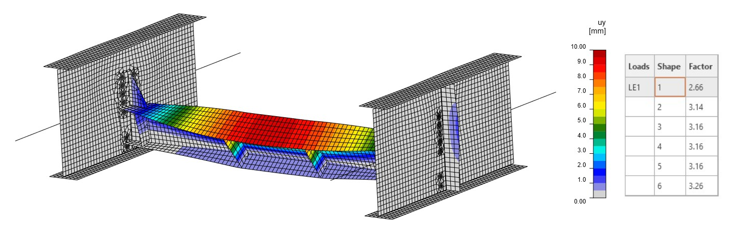 The linear buckling analysis (LBA) shows that the first critical factor reaches a value of 2.66. The first mode shape causes the diaphragm to buckle (Fig. 08). The second factor is close to the first one and reaches a value of 3.14 (Fig. 09). This mode shape causes a local buckling of the web of the main girder. The mode shape and critical factor are influenced by the stiffness of the connections, the stiffness of the main girders, and also the boundary conditions.