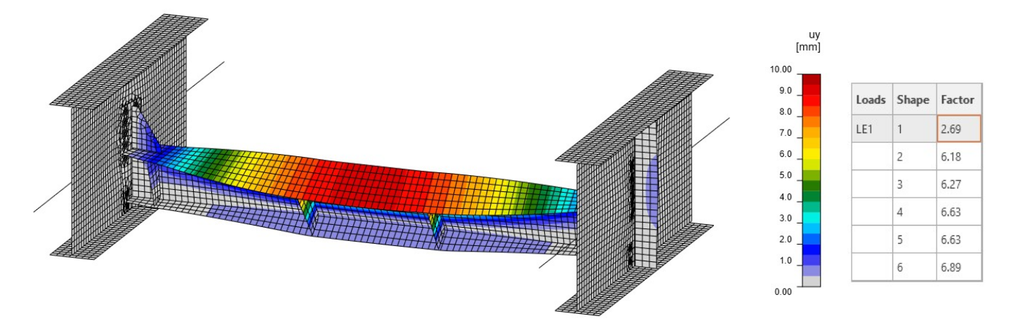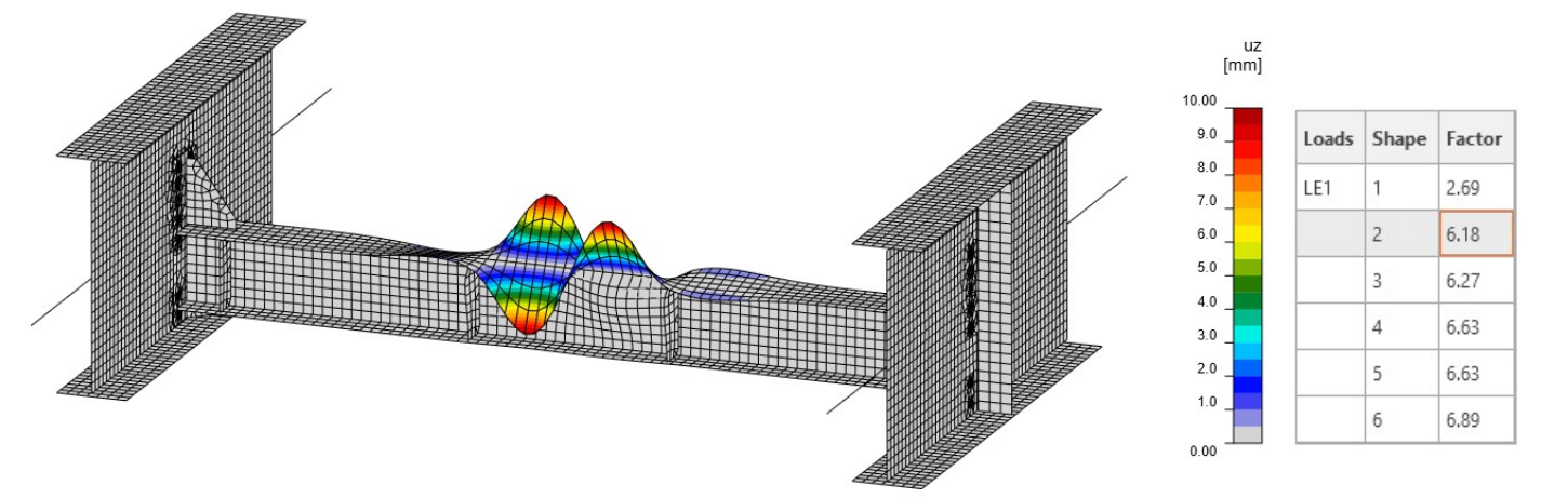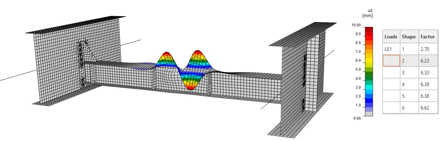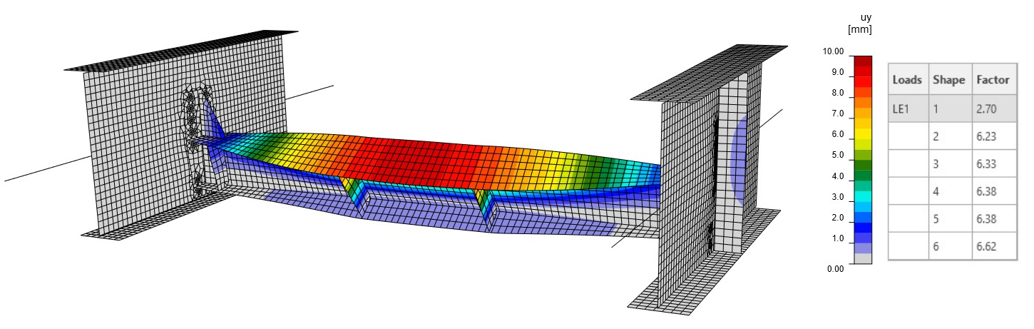 The first mode shape gives a slightly higher critical factor of 2.70 (Fig. 13) compared to the first example (Fig. 08). This effect is caused by the different boundary conditions used in the model. This mode shape represents the diaphragm buckling, and, as we can see, the stresses and the internal forces are approximately the same as those in Fig. 06. This is the reason why the first mode shape looks similar and has almost the same factor. The boundary conditions have a small impact on parts in the segment model, which are indirectly connected with the related members. On the contrary, the second mode shape (Fig. 14) is totally different compared to the one in Fig. 09, with a critical factor of 6.23.  Here, the buckling takes place on the upper flange of the diaphragm.