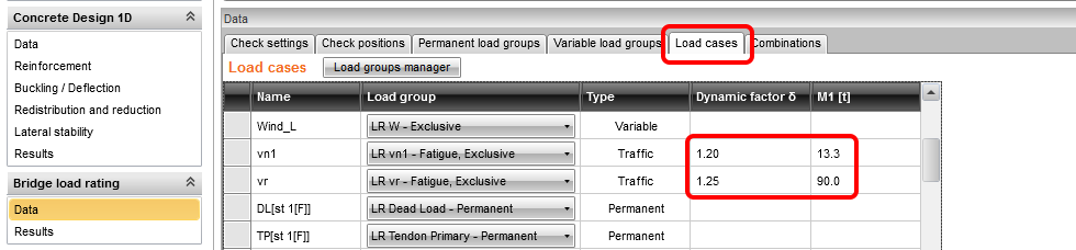 In the next step, check and set load groups of load cases. Start with the load group vn1, which is a code-based vehicular load to determine the normal load-carrying capacity of the bridge. It is important to distinguish this load condition as a traffic load, because by iterative searching for multiple defined traffic load cases, the program calculates load-carrying capacity.