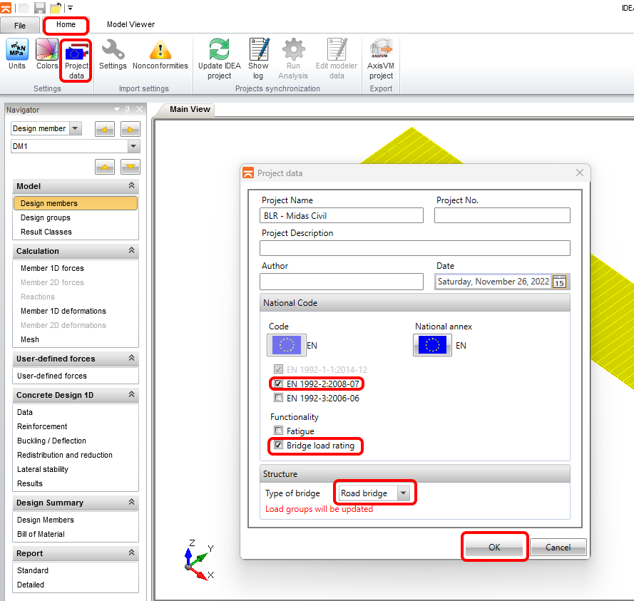 After import, you have to set the calculation parameters in the Project Data tab. The first of them is Code and National annex, then the Type of bridge and finally, turn on the Bridge load rating functionality.