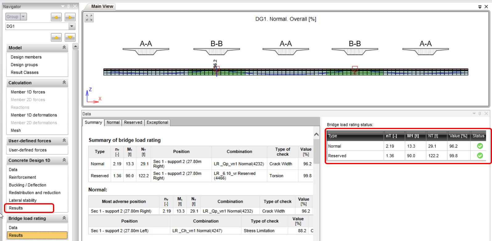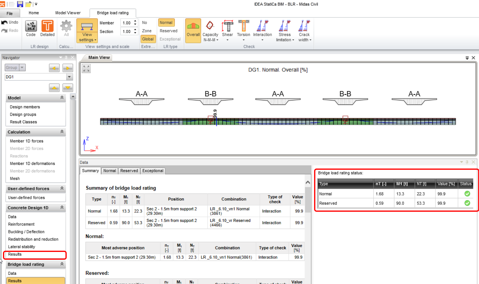 Switch to the Results tab. This will automatically start the calculation, when the program iteratively searches for a multiple of the specified traffic load, at which one of the checks will have a 100% value. After completing the iteration, you can view the resulting load capacity values and load multiples in the right part of the screen. On the left side of this field, the critical check that decided on the load capacity is highlighted.
