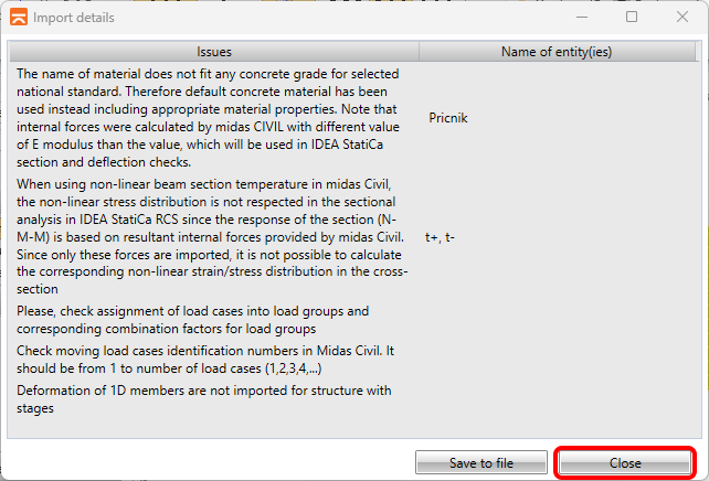 If the program discovers any issues during the import, they will be displayed in the Import Details window. In our case, it is a material with zero density used for the self-weight calculations of the crossbeams.
