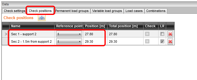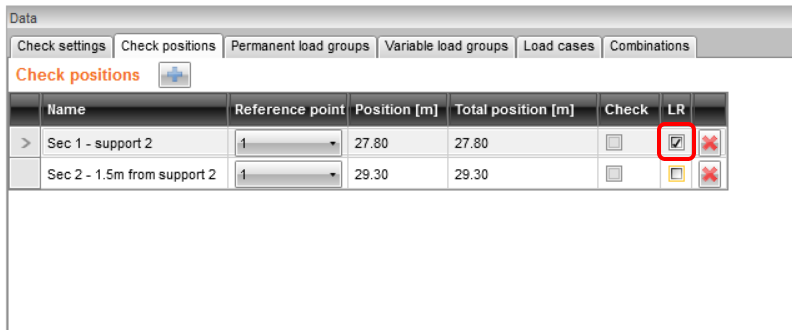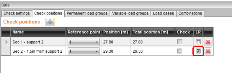 Switch again to the Check position tab and switch the LR checkbox for Section 1. This defines, that the load capacity calculation will be performed only for section 1 (which is the support).