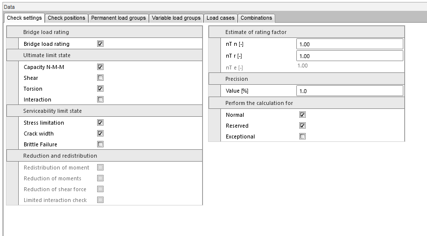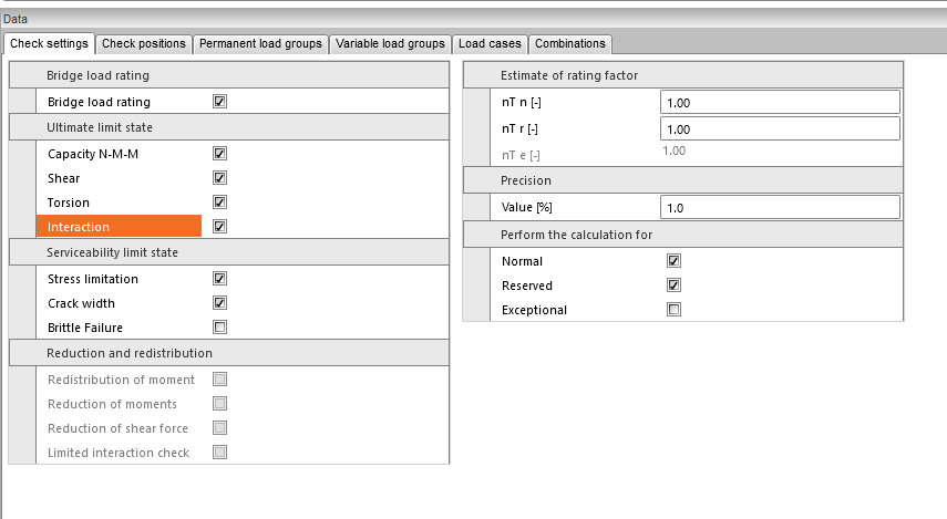 To set the load rating calculation, switch to the Data tab in the Bridge load rating section. The Check Settings tab defines the checks to be performed, we will return to this settings later.