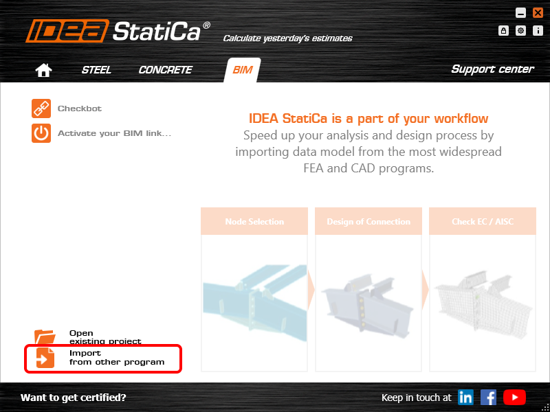 Start the IDEA StatiCa application, select Import from other programs on the BIM tab, and select the prepared .mct file. A source model in Midas Civil is also available in the downloads.