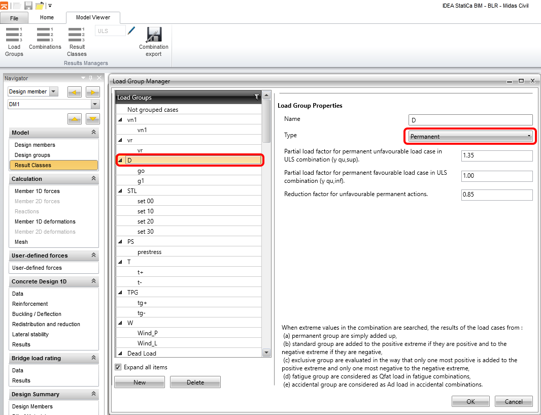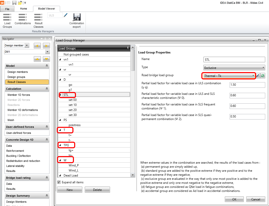 For the settlement, temperature and wind load groups set the load group type Thermal - Tk. This is a way how you distinguish them from traffic loads and permanent loads. The program ignores the values of load factors and combination factors for individual load cases because they were taken from the load combination settings in the Midas Civil program.
