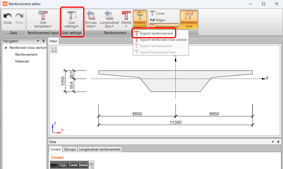 We will use prepared reinforcement templates for both types. Open the reinforcement editor run Reinforcement input dialog and find re A-A.nav file in the project folder.