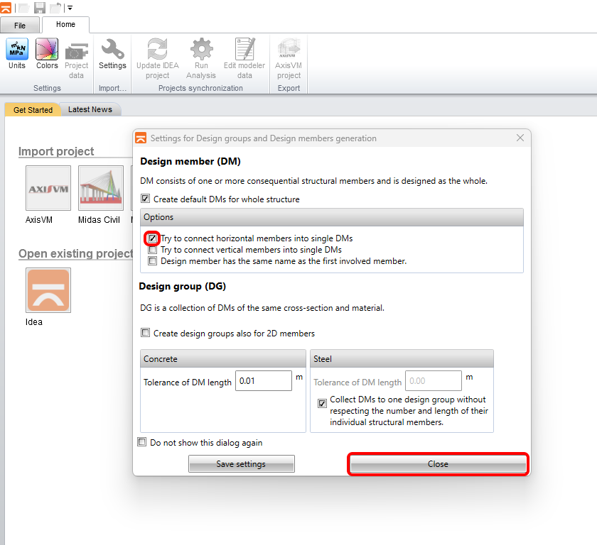If you are importing for the first time, set up the generation of design groups and design members. The program automatically joins the imported bridge superstructure into one design member. This setting can be saved and will not be displayed next time.