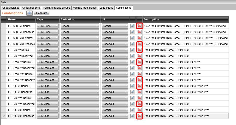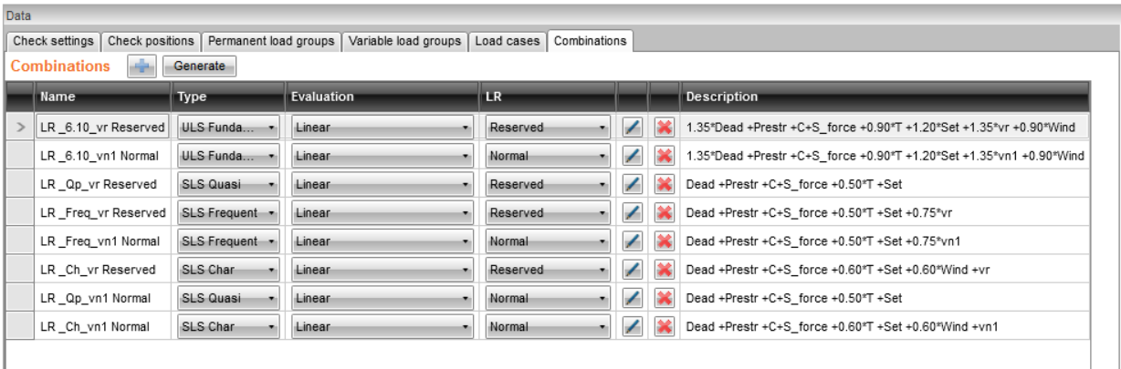 After pressing the Generate button, combinations will be automatically generated. We will revise and reduce their number in the next step because some of them are superfluous. For example, in the first line, there is a combination LR_6.10_vr Normal, in which vr (reserved) traffic load is used for the calculation of normal load capacity. This combination does not make sense, so delete it along with the other redundant combinations.