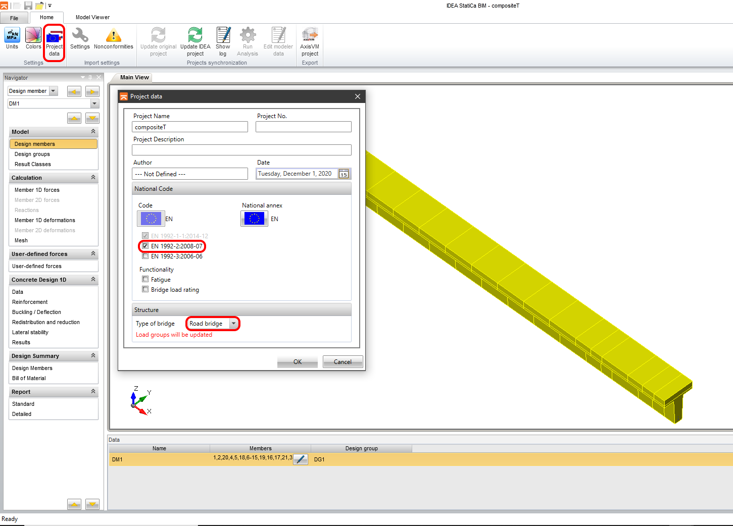 Due to the bridge T-section beam, it is necessary to select the appropriate code. The Project data provides the settings of the code EN 1992-2:2008-07. The load groups are set for the Road bridge in the Type of bridge scroll menu.