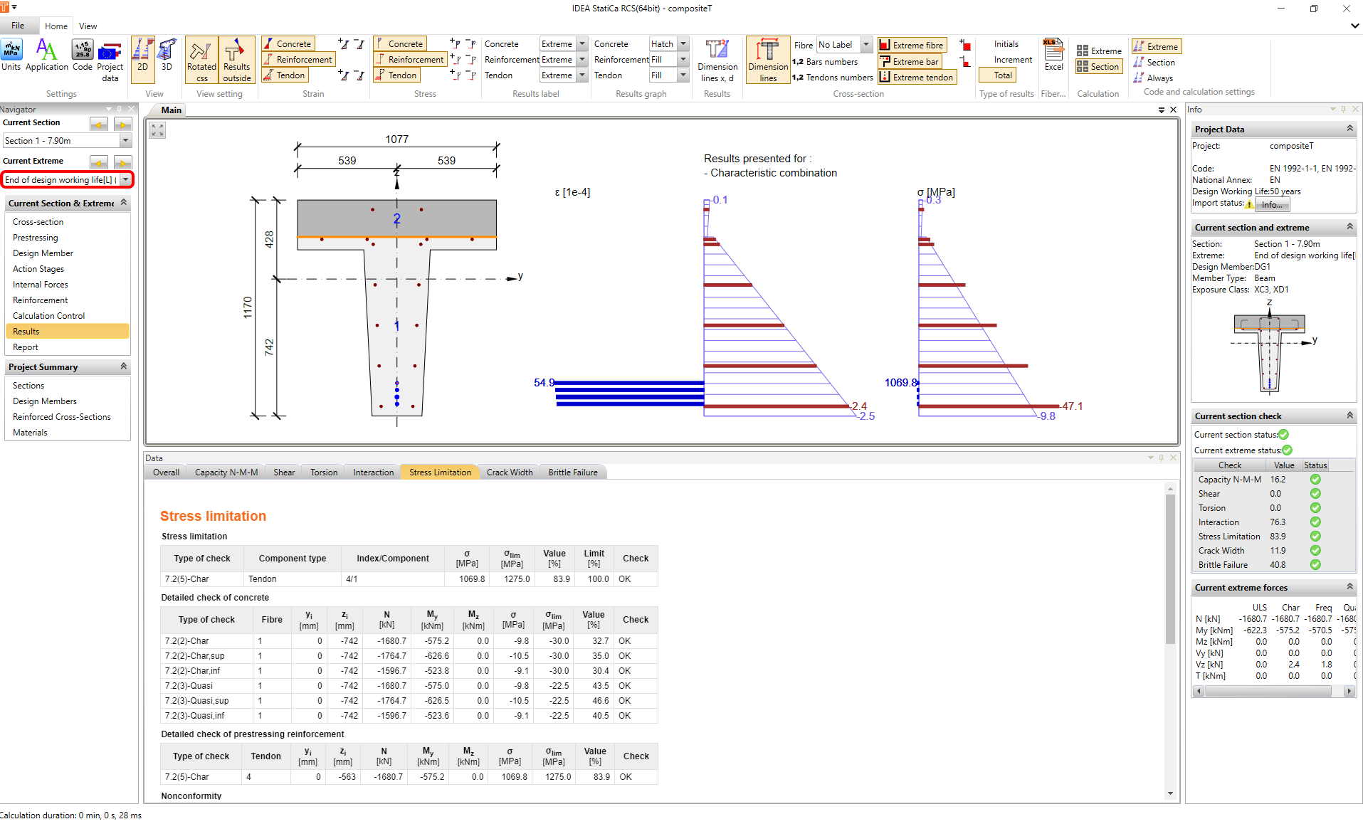The Results card offers in the navigator tree detailed results drawing. In the upper part is located a switcher between stages and sections for the selection of the desired part. Are presented the results of the prestressing stage without a composite slab.