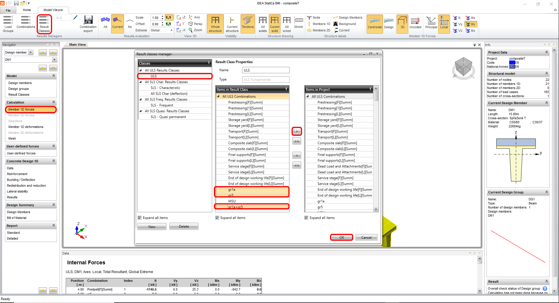 The Result class tab serves for selecting combinations that will be included in the code-check. The envelopes from the Moving load analysis will be deleted because are not sorted to the construction stages and are not important for code-check as the standalone combinations. The envelopes are included in the other combinations with permanent load cases.