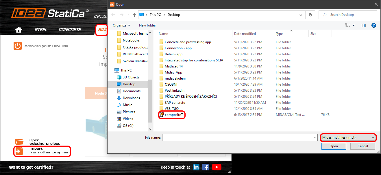 Launch IDEA StatiCa application and move to BIM part. Select the Import from other programs and select the compositeT.mct. The selection of the compositeT.mct will be allowed if you scroll down the menu of supported FEM programs and select Midas mct Files(.mct).