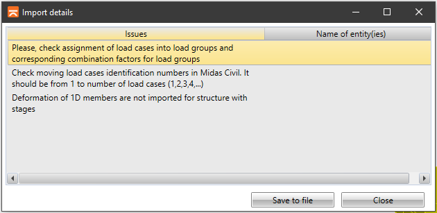 The Import details tab is being informed you what is highly recommended to control or what is not taken over from the Midas Civil.