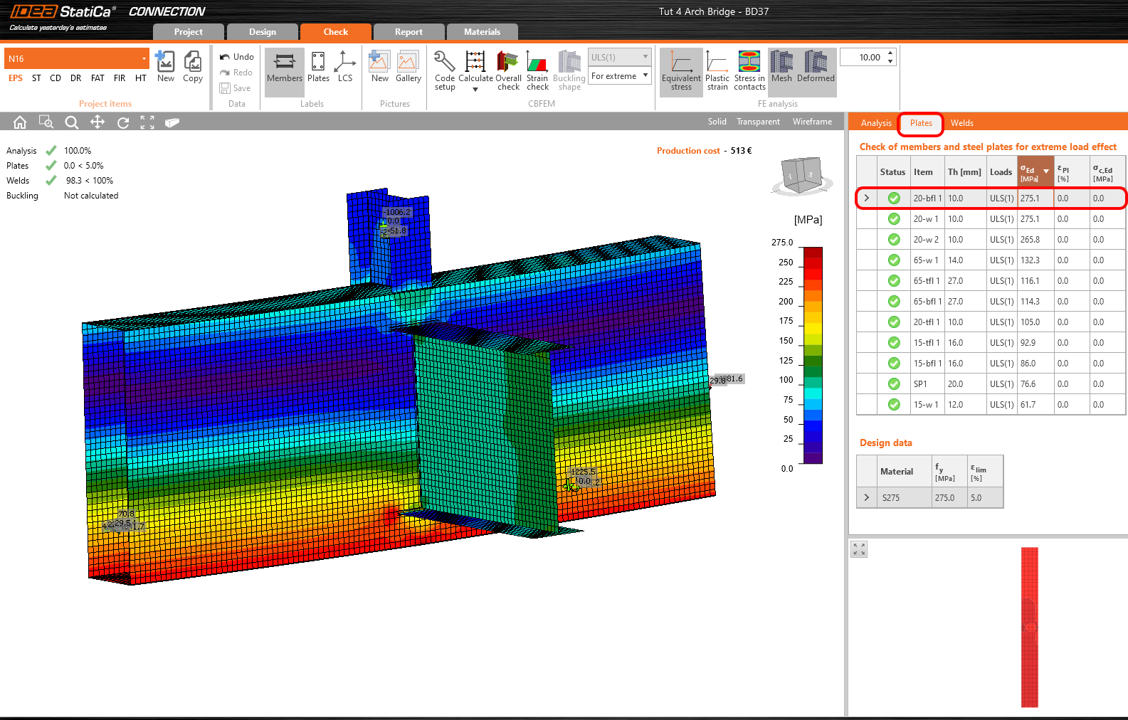 Let's look at the equivalent stress on the plates turned on the mesh and deformed shape with the tab where are sorted out the stresses gradually from the maximum to minimum.
