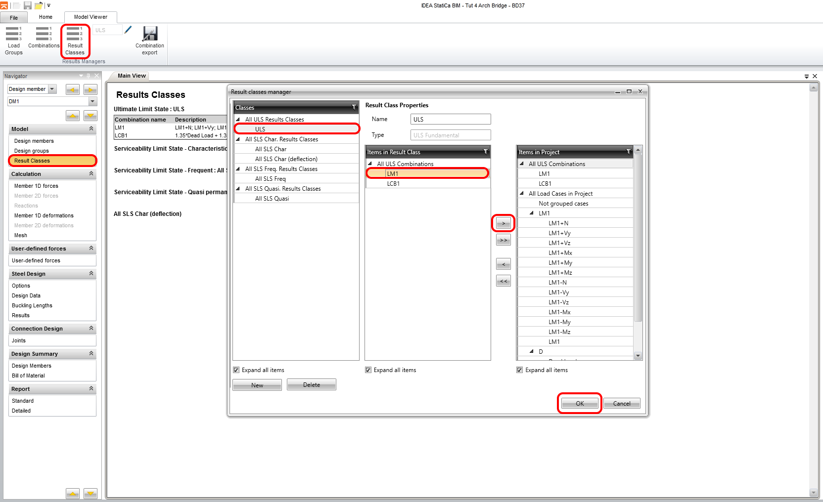 The Result class tab serves for selecting combinations that will be included in the code-check. The envelopes from the Moving load analysis will be deleted. The moving load is included in the combination LCB1 as the static load cases generated in the Midas Civil.