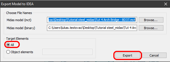Select the path where will be saved the mct. and mid. files. Both files are necessary to have in the same folder. Otherwise, the import to IDEA StatiCa BIM won't be accessible.