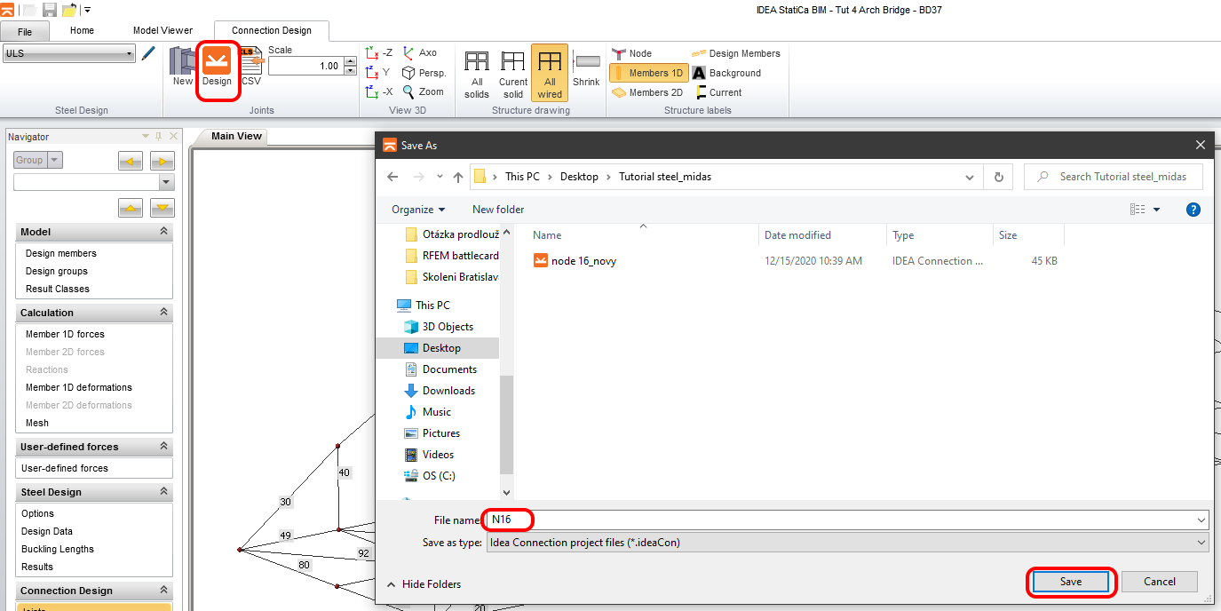 Address the name of the joint for saving and run the application IDEA StatiCa Connection by using the Design button in the ribbon.
