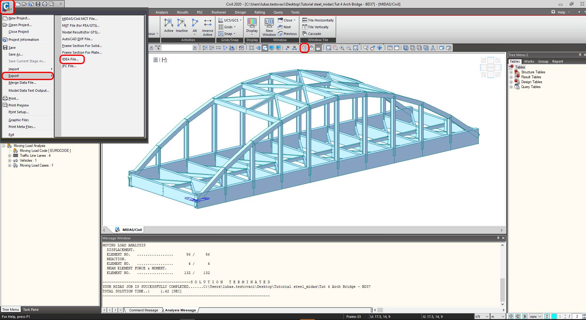 At first, run the linear analysis to get the internal forces. After analysis, go to the menu tree where will be available Export-->IDEA File.