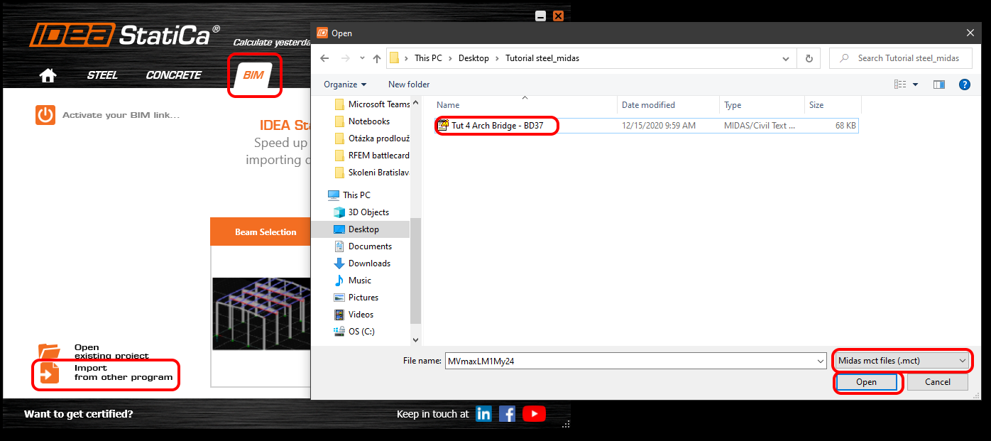 Launch IDEA StatiCa application and move to BIM part. Press the Import from other programs and select the Tut 4 Arch Bridge -BD37. The selection of the .mct file will be allowed if you scroll down the menu of supported FEM programs and select Midas mct Files(.mct).
