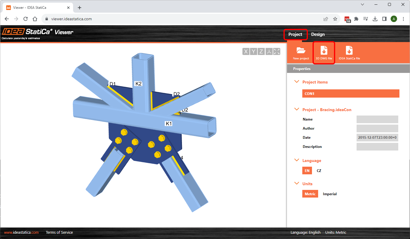 Any IDEA StatiCa Connection project file can be opened in the free online IDEA StatiCa Viewer. This tool also allows the export of the connection model to a 3D DWG file to be opened in any CAD application.