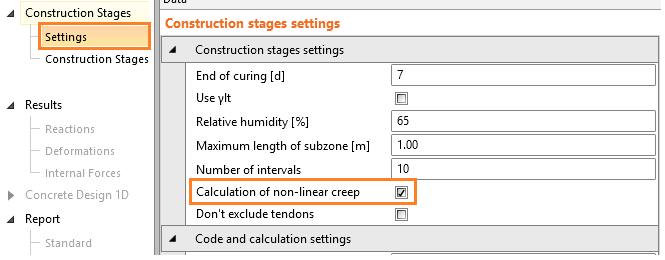 Nonlinear creep calculation is turned on by ticking the "Calculation of non-linear creep" checkbox in Settings of Construction stages menu.