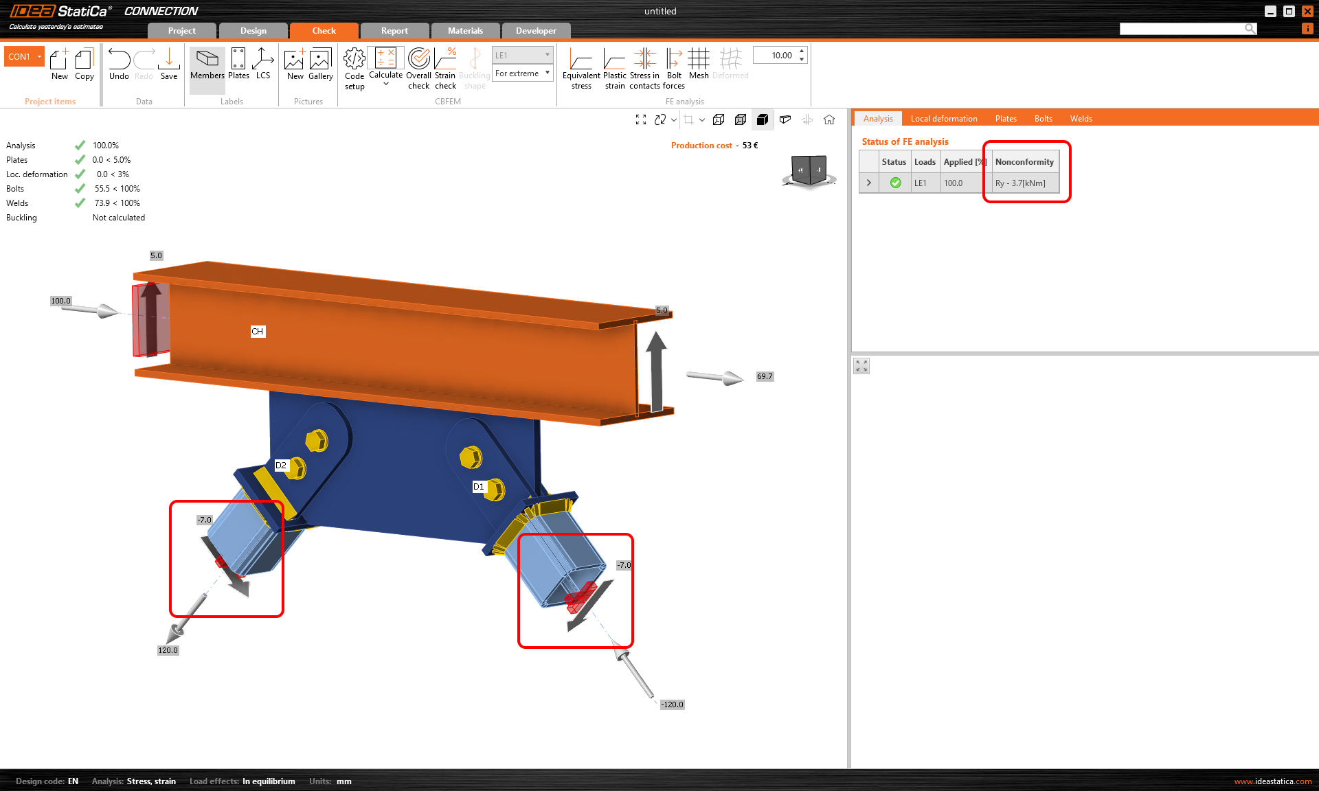 Nonconformities in the tab are summed up from all members of the model and the forces values are displayed in the global coordinate system.
