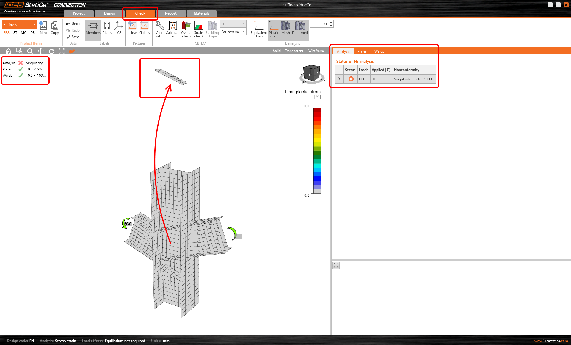 By introducing additional supports to members' ends (restrictions to boundary conditions), which can be done through the Model type option of a member e.g. N-Vy-Mz, a nonconformity is displayed in the Analysis tab in Check after the calculation.