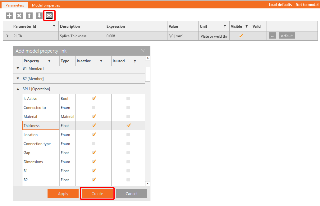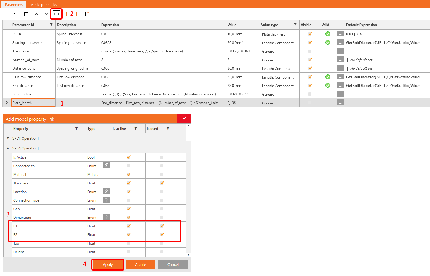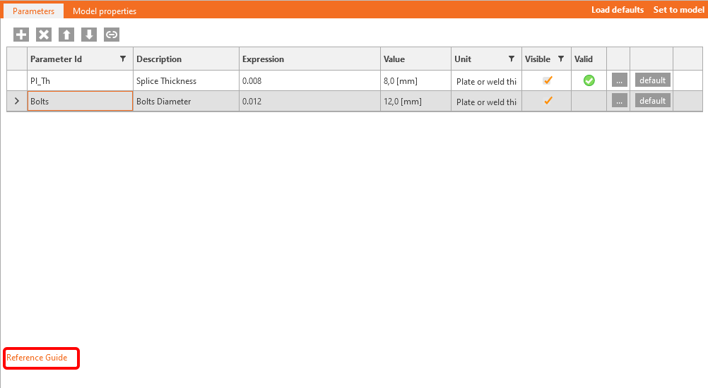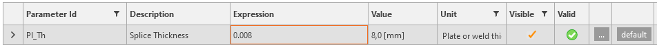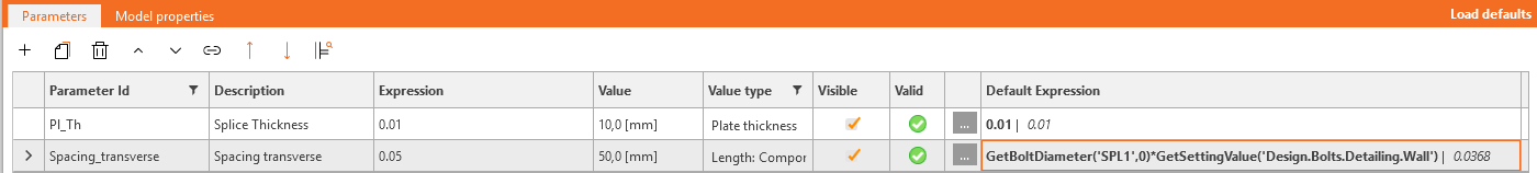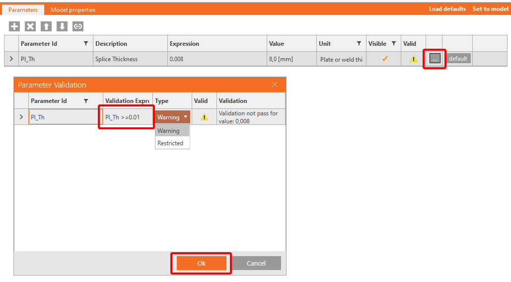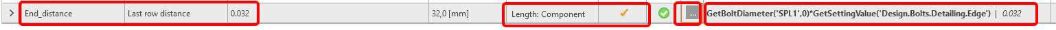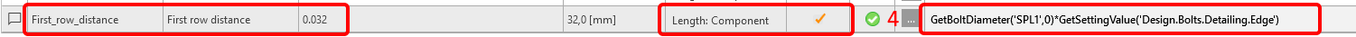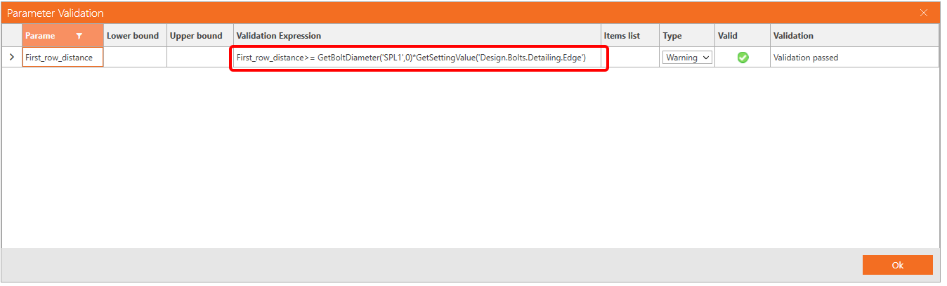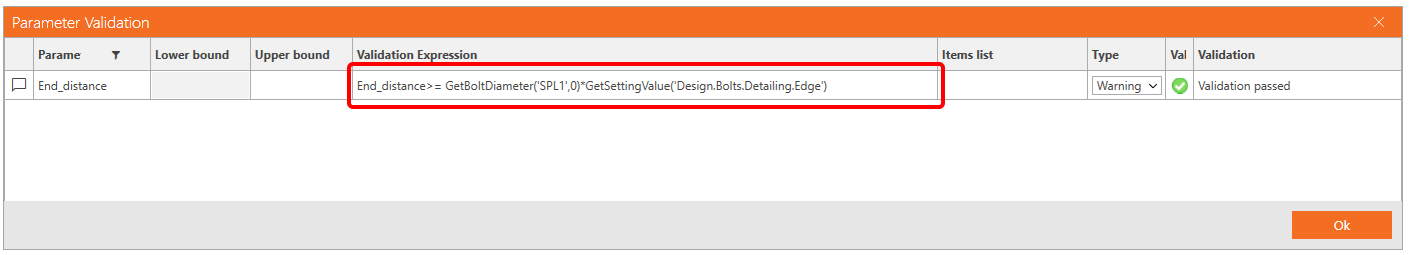 You also want to display a Warning if the value is less than two diameters. For this purpose, click the button with three dots (4) to open the Parameter Validation window and enter the expression First_row_distance>=GetBoltDiameter('SPL1',0)*GetSettingValue('Design.Bolts.Detailing.Edge').