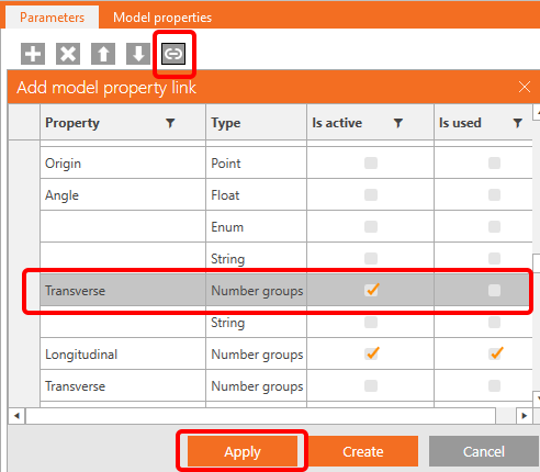 To enable link between the operations and parameters is necessary to add property link between the objects.