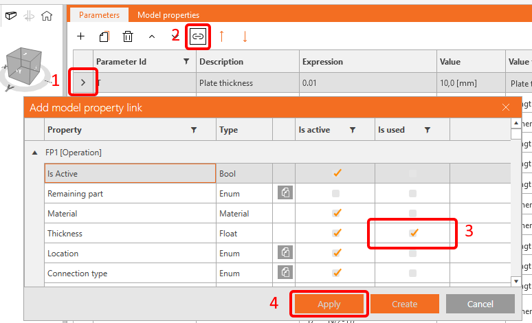 The parameters T (Plate thickness) an G (Gap) you can now directly link to the operation FP1.