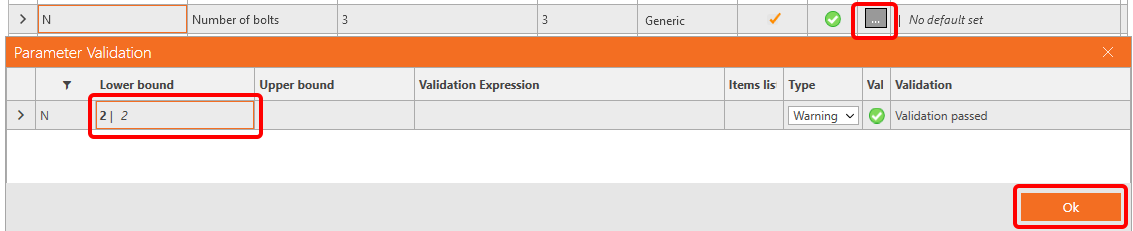 For the field Number of bolts, we would like set a warning to have an imput of at least two bolts. For this, set the Lower bound to the value 2.