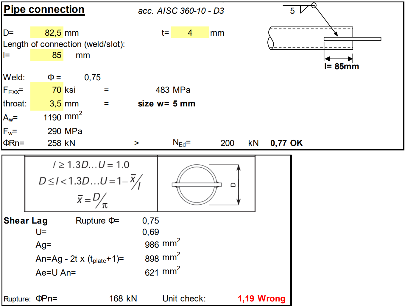 Type of connection: Pipe – Shear lag connection in bracing