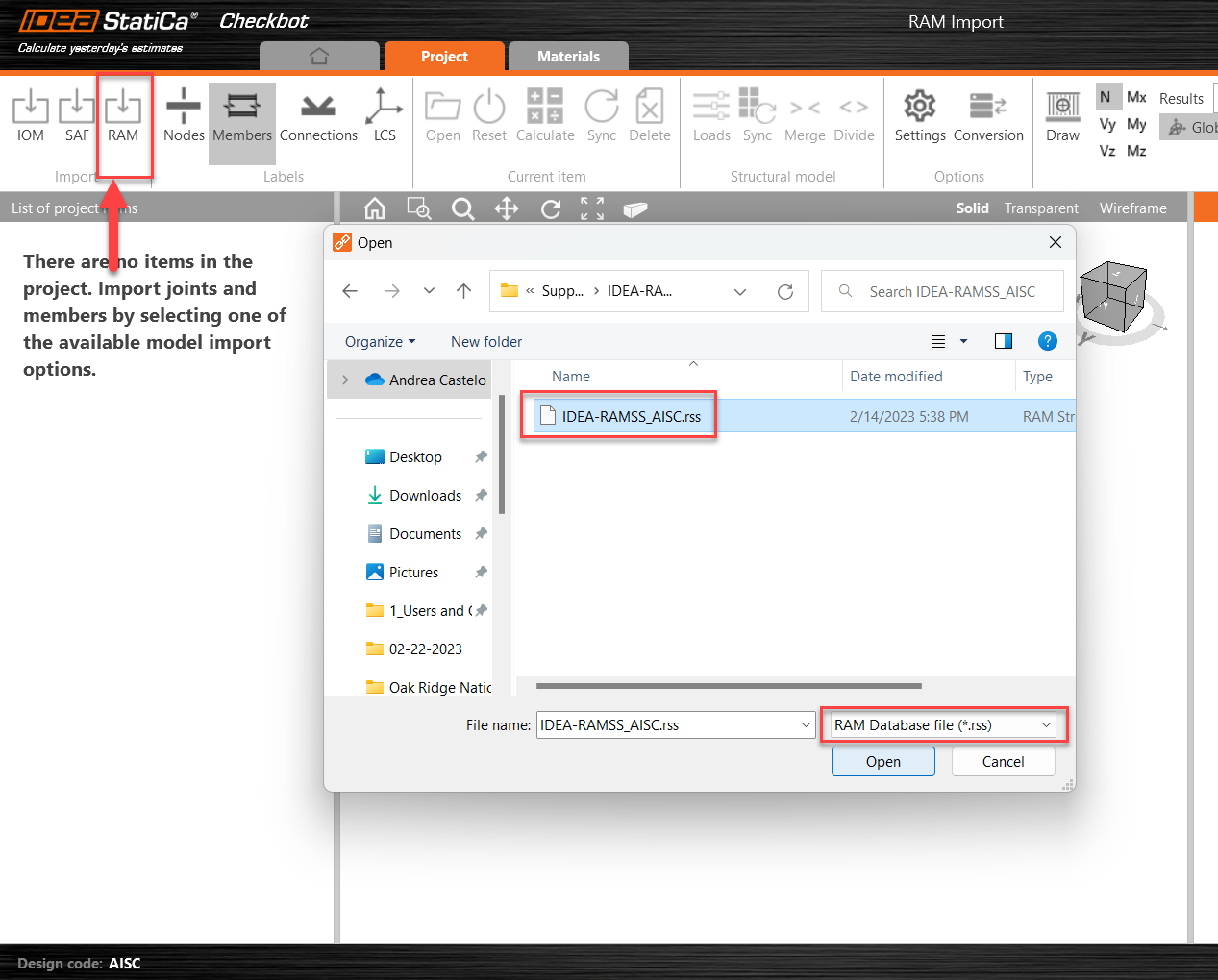 5. Once the project is created, from the import options, select ‘RAM’. A dialogue will appear, allowing you to select a RAM Database file (*.rss). Select the desired project.
