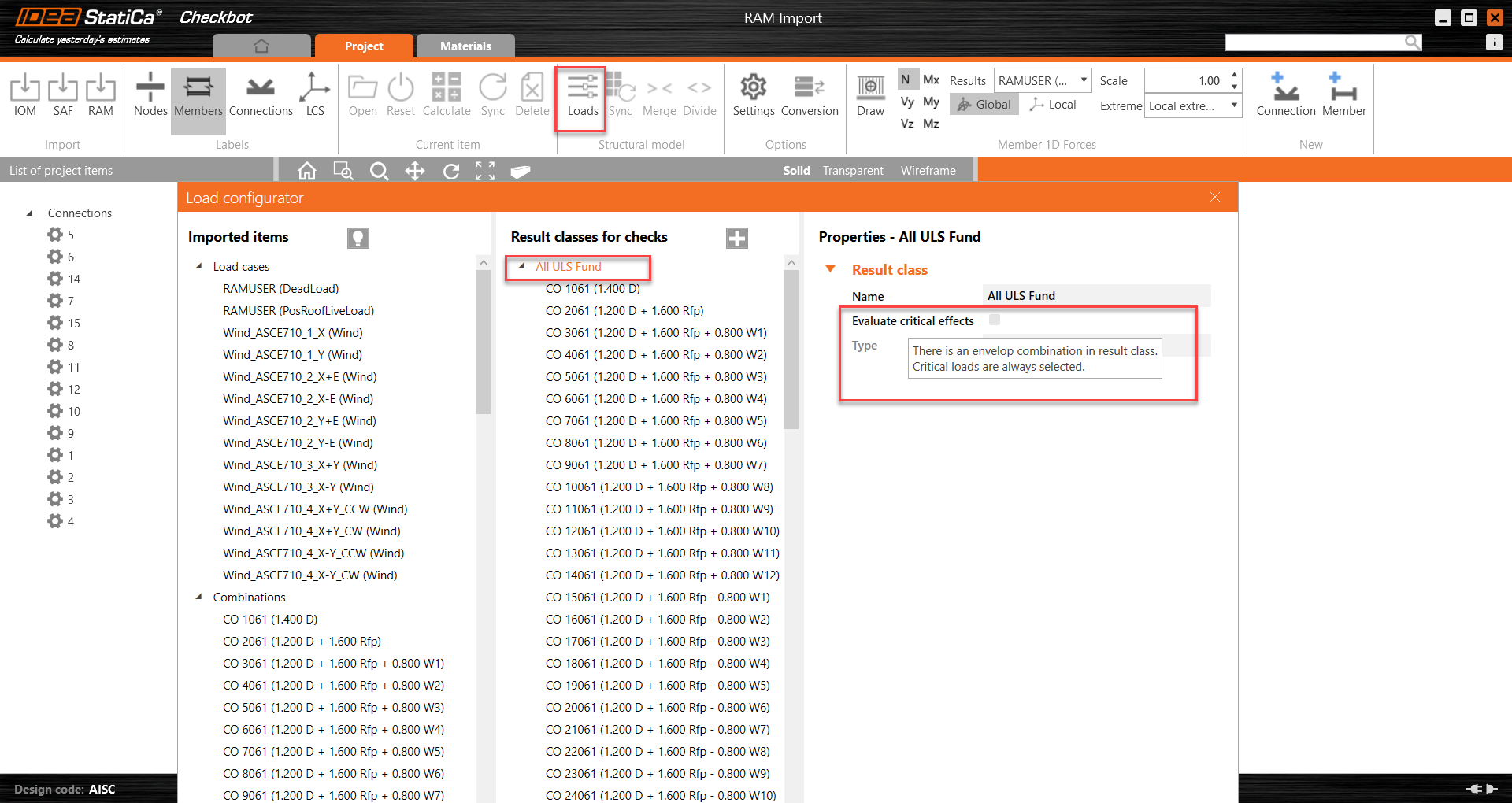 8. Click on Loads Icon to review loads and load combinations. In the load configurator, when evaluate critical effects is activated under Result classes, only the worst load cases will be reviewed on all the connections.
