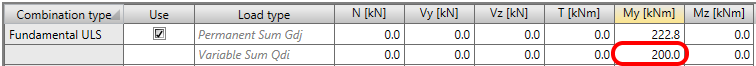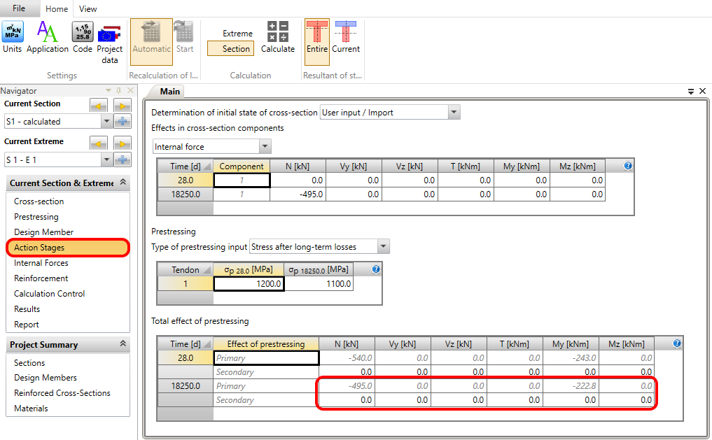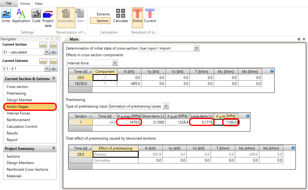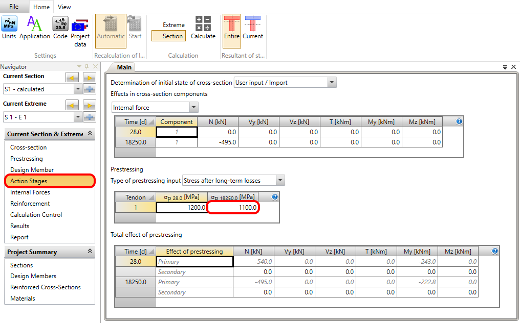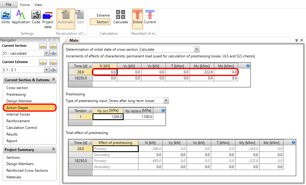 For our example, N=0 kN and M = Mdl = 222.8 kNm are inputted for t=28d stage.