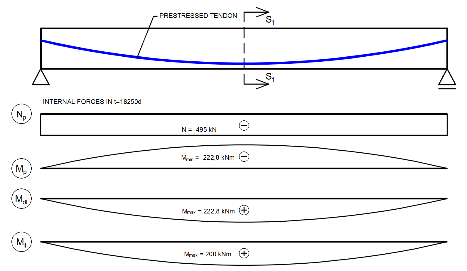 There will be the bending moment from dead load Mdl, a bending moment from live load Mll, and a bending moment from prestress Mp. Moreover, there will be a normal force from prestress Np. Beam and internal forces are explained in the figure below.